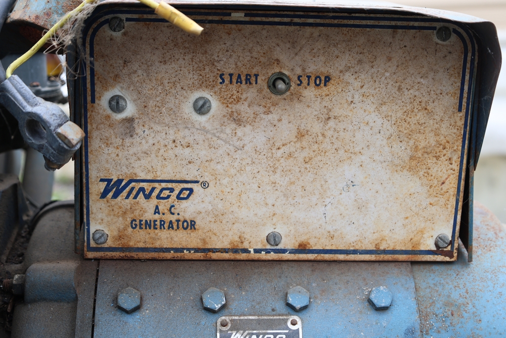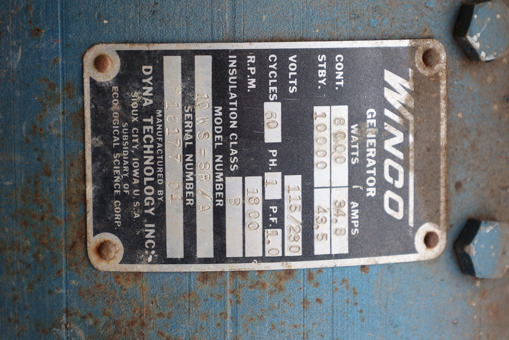 Winco AC generator, model 10WS-3R/A, 115/230 volt, 8000 continuous watts, 10000 standby watts, powered by Wisconsin VF4D engine, skid mounted.