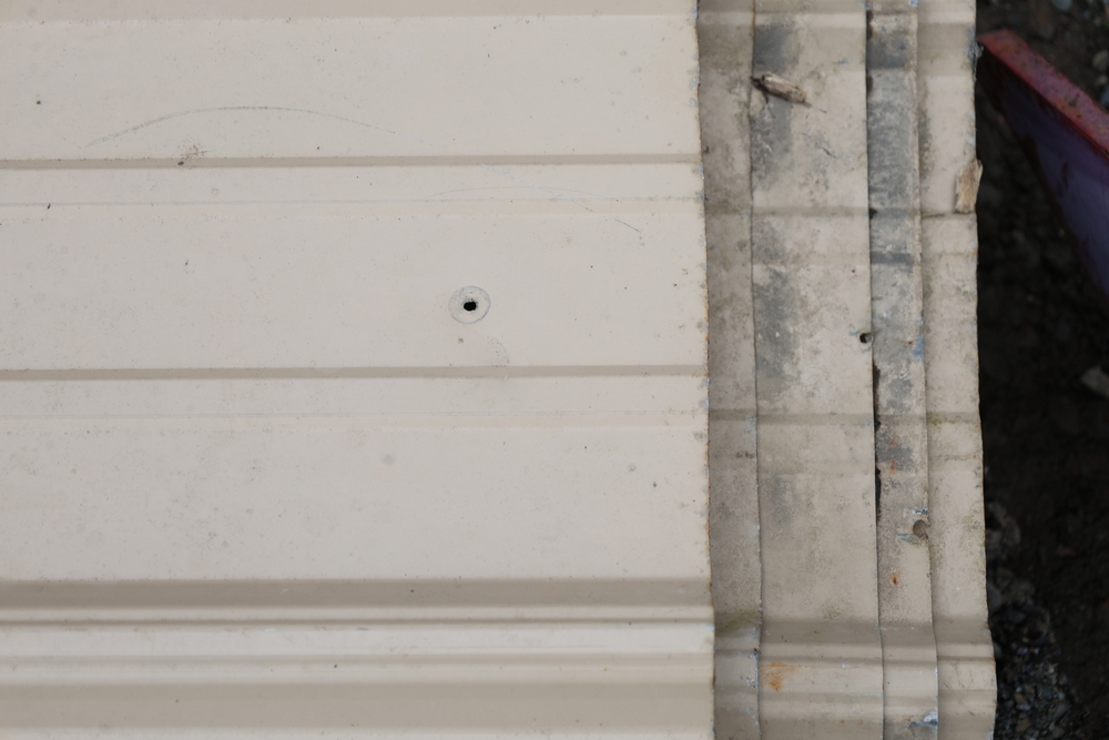 Stack of previously used metal roofing panels, various lengths with some cut sections and angled ends, with fastener holes.