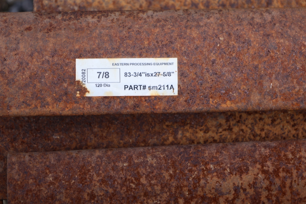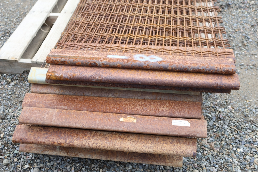 Stack of steel grating panels with welded wire grid construction; label indicates Eastern Processing Equipment with part number sm211A and size marked 83-3/4 in x 27-5/8 in; seller reports: for use with Extec screener.