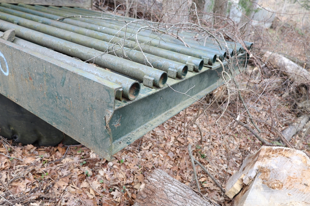 Steel cattle guard section with tubular bar top, approximately 16 ft long x 82 in wide.