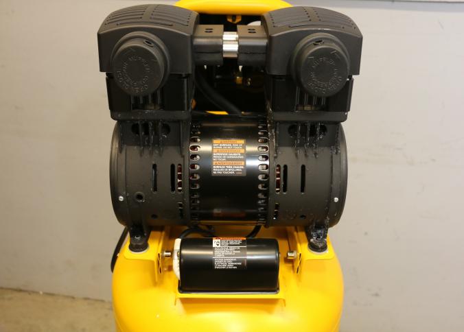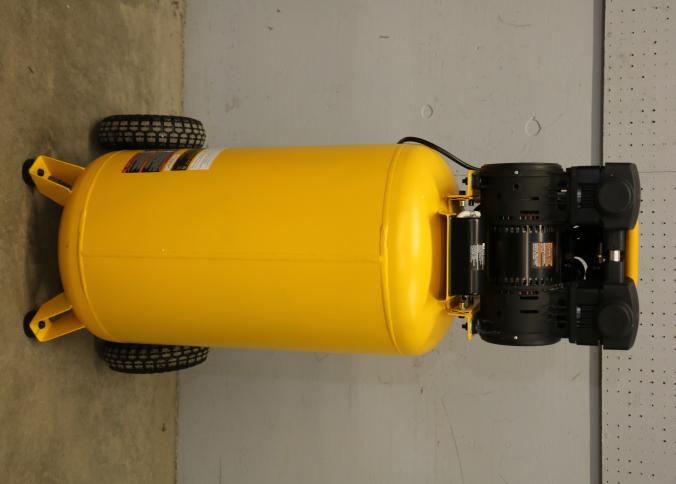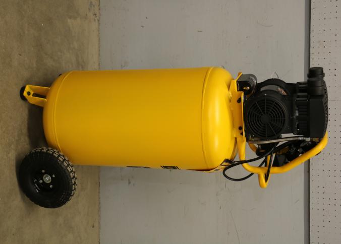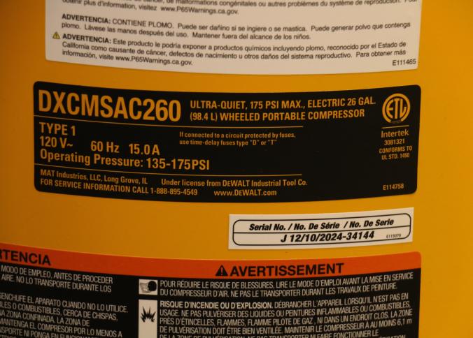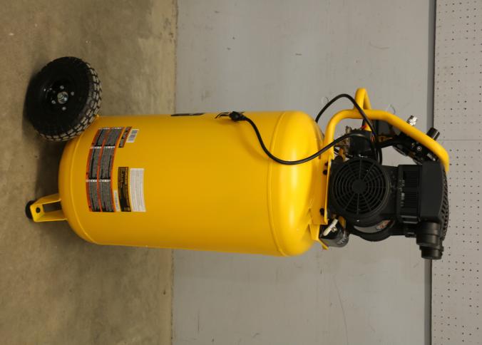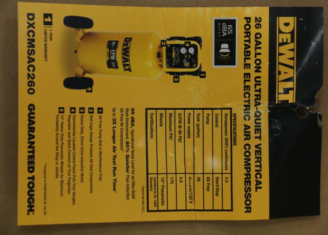 DeWalt 26-Gallon Vertical Wheeled Portable Electric Air Compressor, Model DXCMSAC260. Features a maximum pressure of 175 PSI, quiet operation at 65 dBA, 2 HP motor, and a 26-gallon tank. Operates on 120V with a 15A draw. Pickup only.