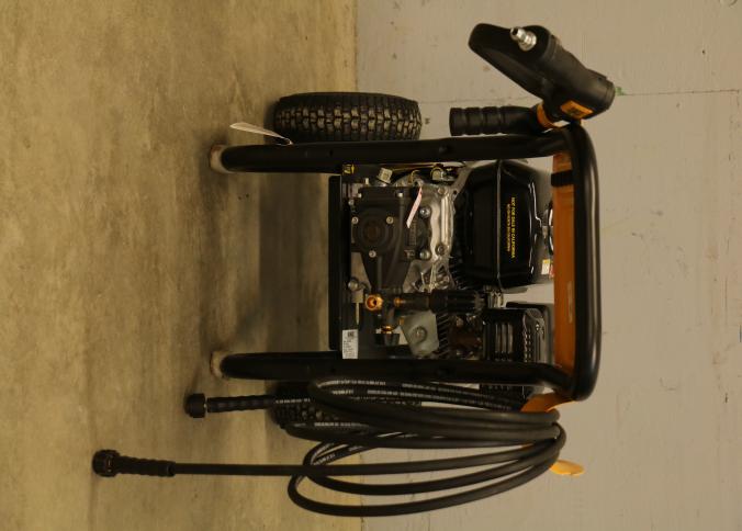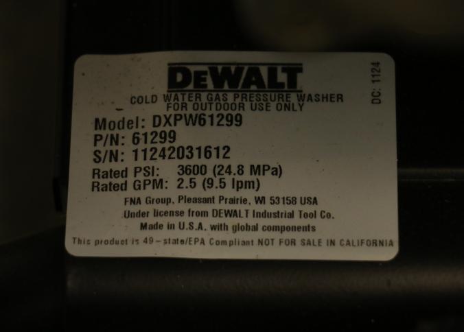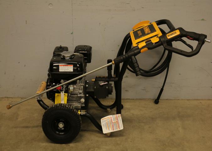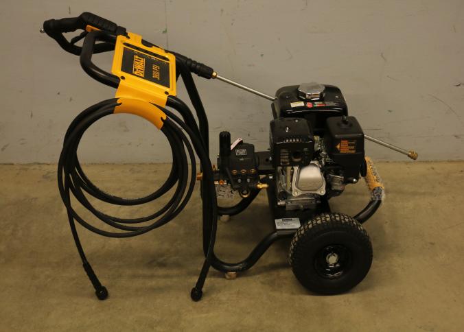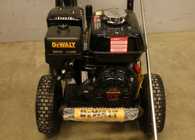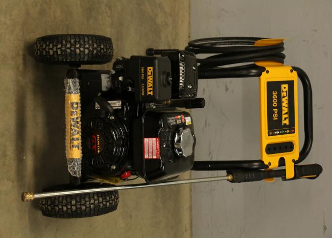 DeWalt Cold Water Gas Pressure Washer, Model DXPW61299, with a maximum pressure rating of 3600 PSI and a flow rate of 2.5 GPM. Equipped with a gas-powered engine and a sturdy frame with wheels for mobility. Includes attached hose and trigger spray gun for outdoor cleaning tasks. Hardware not included. Pickup only.