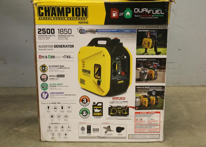 Champion 2500-Watt Dual Fuel Inverter Generator, Model 201530. Features 1850 running watts and 2500 starting watts, dual fuel capability for gasoline or propane, and ultra-quiet operation. Includes a compact portable design with multiple outlets and easy-to-use controls. Includes original box. Pickup only.
