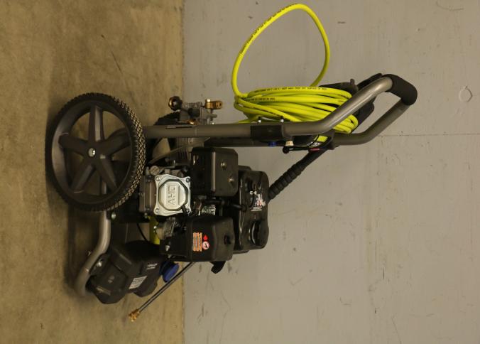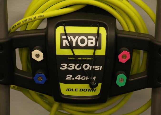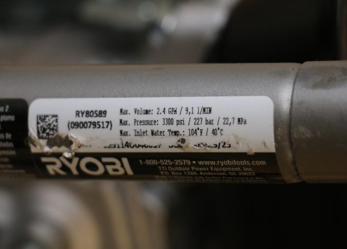 Ryobi 3300 PSI 2.4 GPM gas pressure washer, Model RY80589, with idle down functionality. Features a durable handle with padded grip, large wheels for mobility, and various nozzle attachments for versatile cleaning options. Includes a coiled hose and spray gun. Wheel is lose and foam handle has damage. Pickup only.