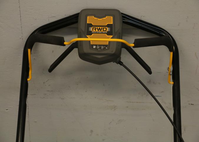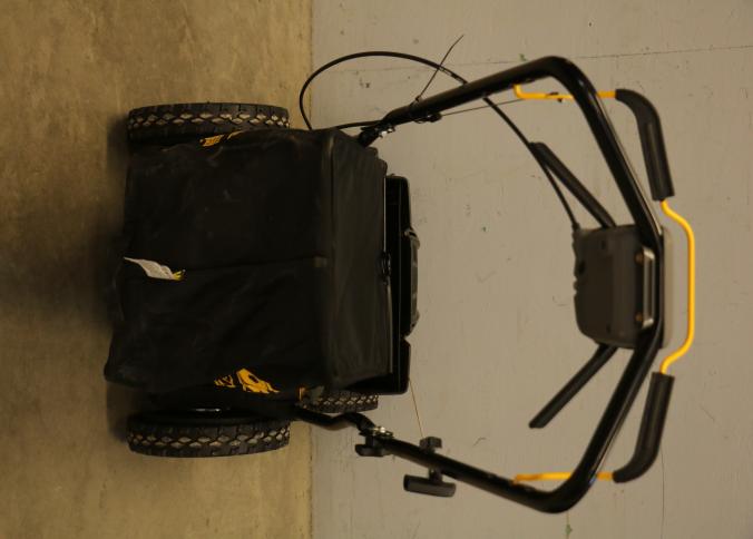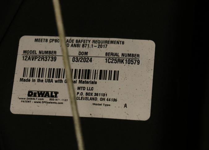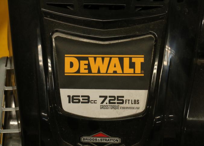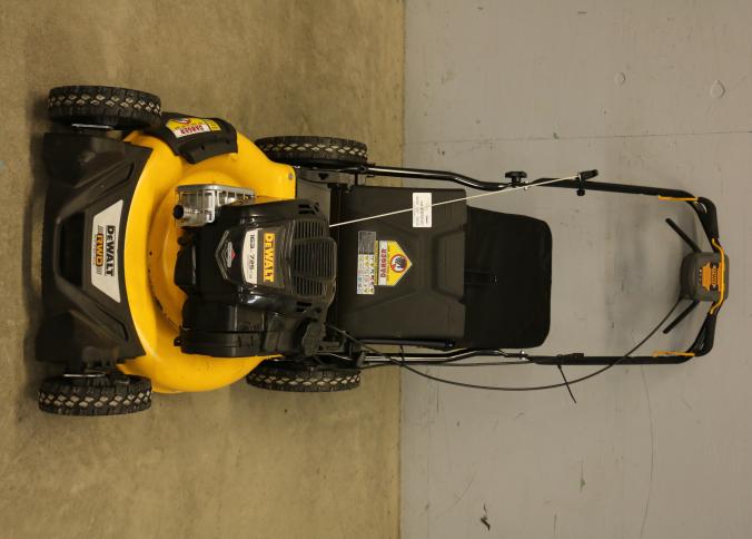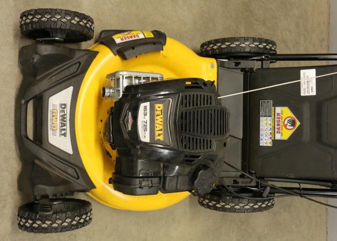 DeWalt Gas-Powered Lawn Mower, Model 12AVP2R3739, featuring a 163cc engine. Equipped with rear-wheel drive, a durable grass collection bag, and ergonomic handle controls. Includes a 7.25 ft-lbs gross torque rating. Hardware not included. Pickup only.