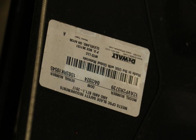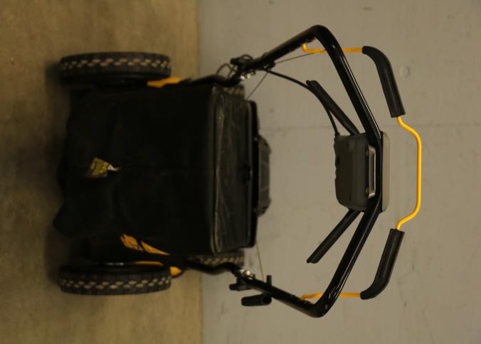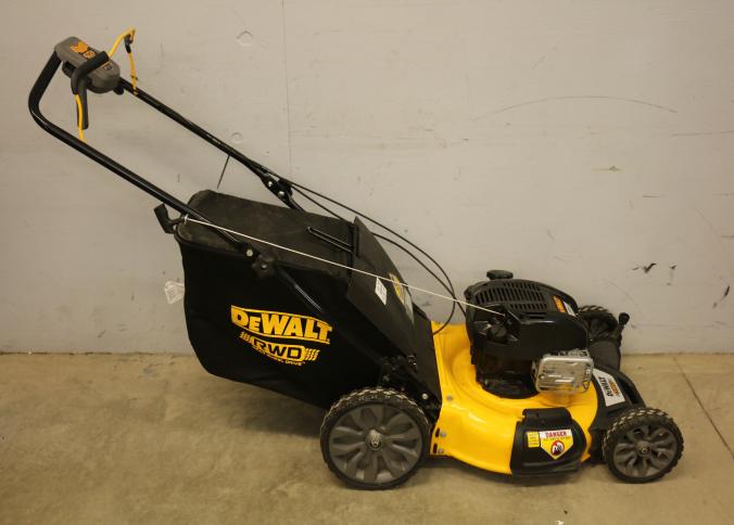 DeWalt Gas-Powered RWD Lawn Mower, Model 12AVP2R3739. Features a rear-wheel-drive system, Briggs & Stratton engine, large rear wheels for added traction, height-adjustable handle, and an attached grass collection bag. Pickup only.