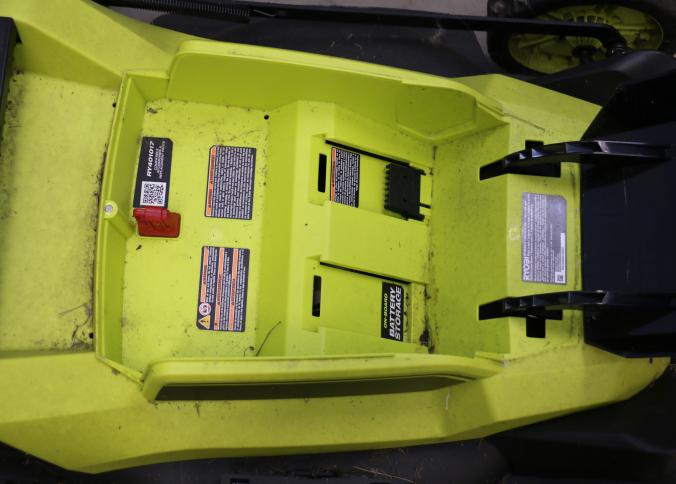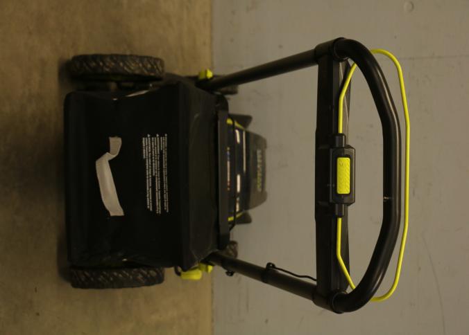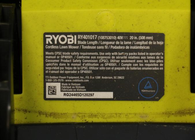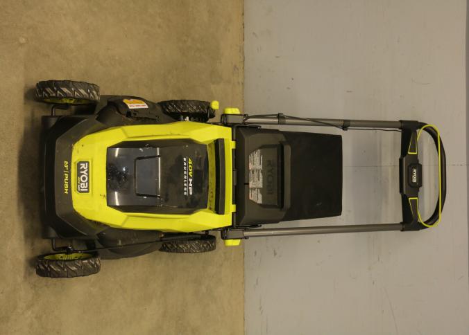 Ryobi 20-Inch 40V Cordless Lawn Mower, Model RY401017, featuring a 20-inch blade length. Includes a collapsible handle and a rear grass collection bag. Does not include 40v batteries. Pickup only.