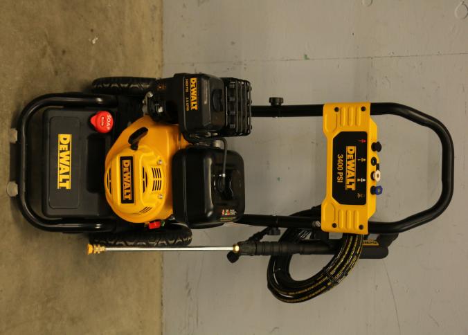 DeWalt 3400 PSI gas-powered pressure washer, Model DXPW616372, with a 2.5 GPM flow rate. Features a robust design with a yellow and black frame, large wheels for mobility, and an ergonomic spray wand. Equipped with detergent capability for efficient cleaning. Includes hoses and attachments. Pickup only.