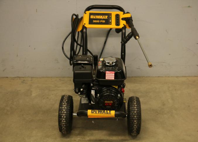 DeWalt 3600 PSI Gas Pressure Washer, Model DXPW61299. Features a Honda engine, hose, trigger handle, and spray wand. Includes large tires for mobility and a steel frame for durability. Rated for 2.5 gallons per minute. Pickup only.