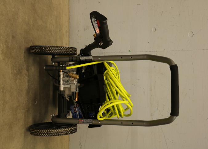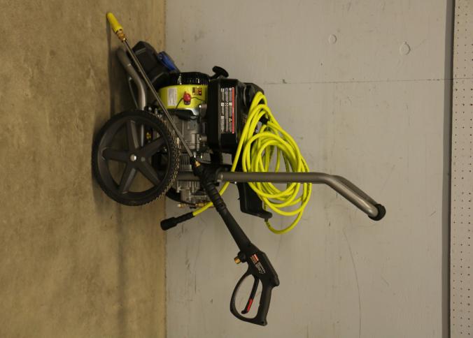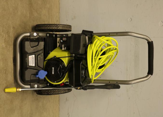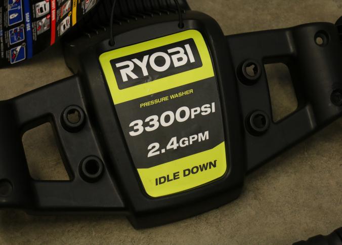 Ryobi gas pressure washer rated at 3300 PSI and 2.4 GPM, Model RY80589, including wand and hose. Features idle-down technology, a durable steel frame, and a high-pressure hose. Includes user-friendly controls, large wheels for ease of mobility, and an ergonomic spray wand. Pickup only.