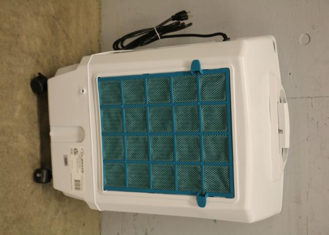 Bonaire Hi Flo 450 CFM Portable Evaporative Air Cooler with Remote, Model CDU6280064. Features include an adjustable control panel, remote control, and a removable filter. Pickup only.