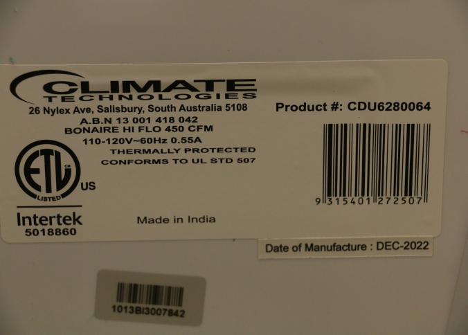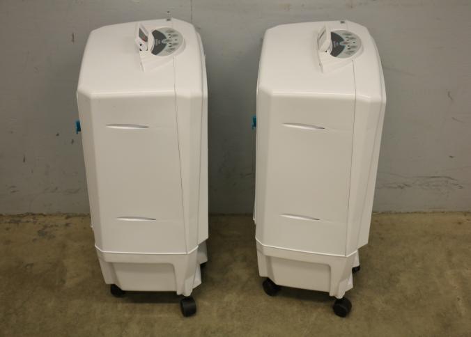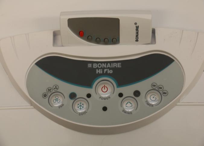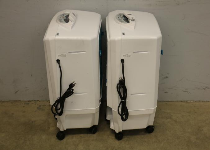 Two Bonaire Hi Flo 450 CFM Portable Evaporative Air Coolers with Remote, Model CDU6280064. Features adjustable control panel, remote control, and a removable filter. Built-in casters for mobility and designed for efficient cooling. Includes original remote controls and instructions. Pickup only.