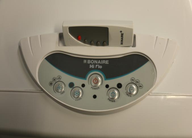 Bonaire Hi Flo 450 CFM Portable Evaporative Air Cooler with Remote, Model CDU6280064. Features an adjustable control panel for user preferences, a remote control for convenience, and a removable filter for easy maintenance. Compact design includes built-in casters for mobility and a housing labeled with model details. Pickup only.
