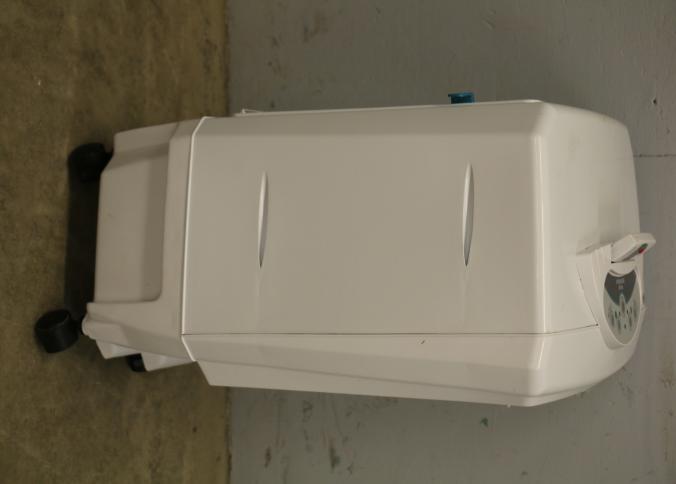 Bonaire Hi Flo 450 CFM Portable Evaporative Air Cooler with Remote, Model CDU6280064. Features an adjustable control panel, remote control, and a removable filter for easy maintenance. Includes rolling casters for portability. Operates on 110-120V, 60Hz, with a power consumption of 0.55A. Pickup only.