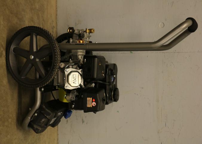 Ryobi gas pressure washer, Model RY80589, featuring a maximum pressure of 3300 PSI and a flow rate of 2.4 GPM. Includes a durable two-wheel frame, hose, and spray gun attachment. Designed for efficient cleaning tasks. Pickup only.