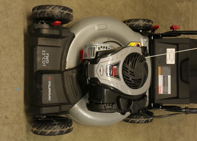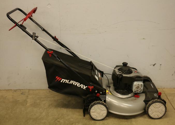 Murray 22-Inch Lawn Mower, Model MNA153003, with Briggs & Stratton Engine. Features a 22-inch cutting width, 140cc E550 Prime Briggs & Stratton engine, and a rear grass collection bag. Includes forward-wheel drive and manual height adjustments. Hardware not included. Pickup only.
