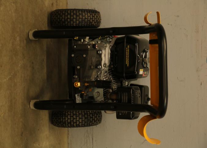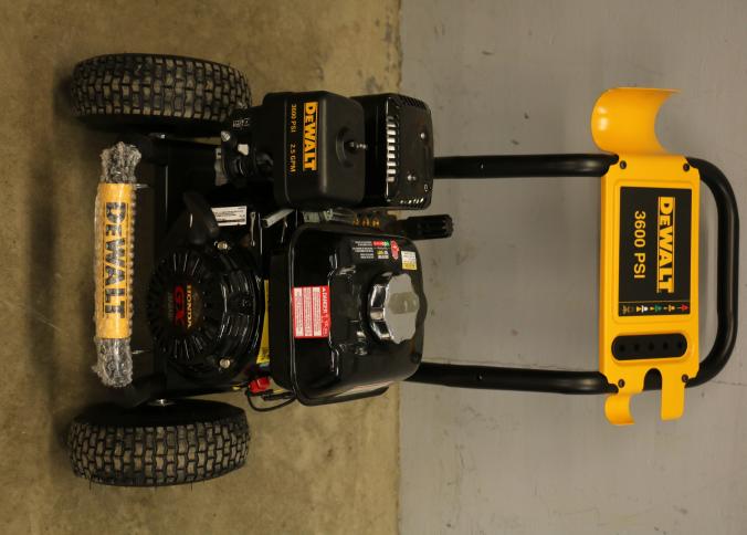 DeWalt 3600 PSI Gas Pressure Washer Model DXPW3625 with 2.5 GPM flow rate. Features a durable gas-powered engine, two large tires for mobility, and sturdy frame construction with an ergonomic handle for ease of use. Includes an attached hose. Hardware not included. Unit has compression but does not start. Pickup only.