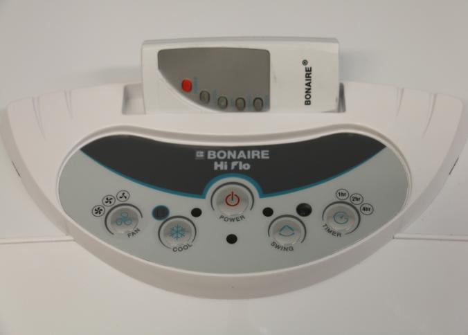 Bonaire Hi Flo 450 CFM Portable Evaporative Air Cooler with Remote, Model CDU6280064. Features an adjustable control panel, remote control for convenience, and a removable filter for easy maintenance. The unit is designed to be portable with caster wheels. Power requirements are 110-120V~60Hz 0.55A. Pickup only.