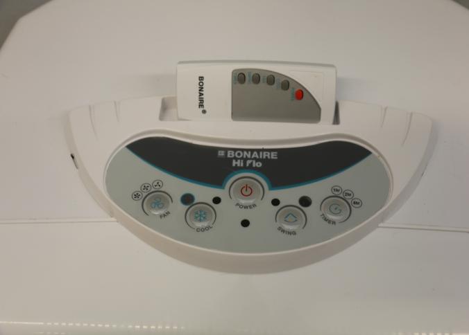 Bonaire Hi Flo 450 CFM Portable Evaporative Air Cooler, Model CDU6280064. Features an adjustable control panel, a remote control, and a removable rear air filter for ease of maintenance. Includes caster wheels for mobility and a convenient cord storage option. Pickup only.