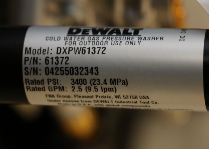 DeWalt DXPW61372 Cold Water Gas Pressure Washer, 3400 PSI. Powered by a gas engine, this pressure washer is rated for 2.5 GPM (gallons per minute) and 3400 PSI (pounds per square inch) for outdoor use. Features a durable frame with wheels for enhanced mobility. Hardware not included. Unit does not have compression and does not start. Pickup only.