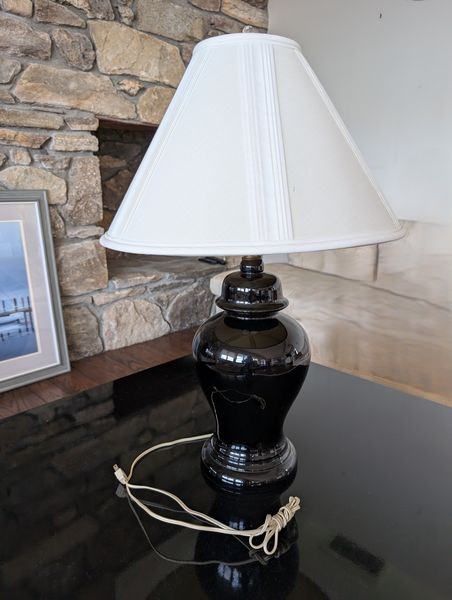 Contemporary Table, Lamp, Art. Black lacquer coffee table, 43"sq x15"H; modern gooseneck floor lamp (1'diameter base), approx. 76"H; sailboat framed wall art, 29"Wx35"H; black jar-style table lamp, 31"H.