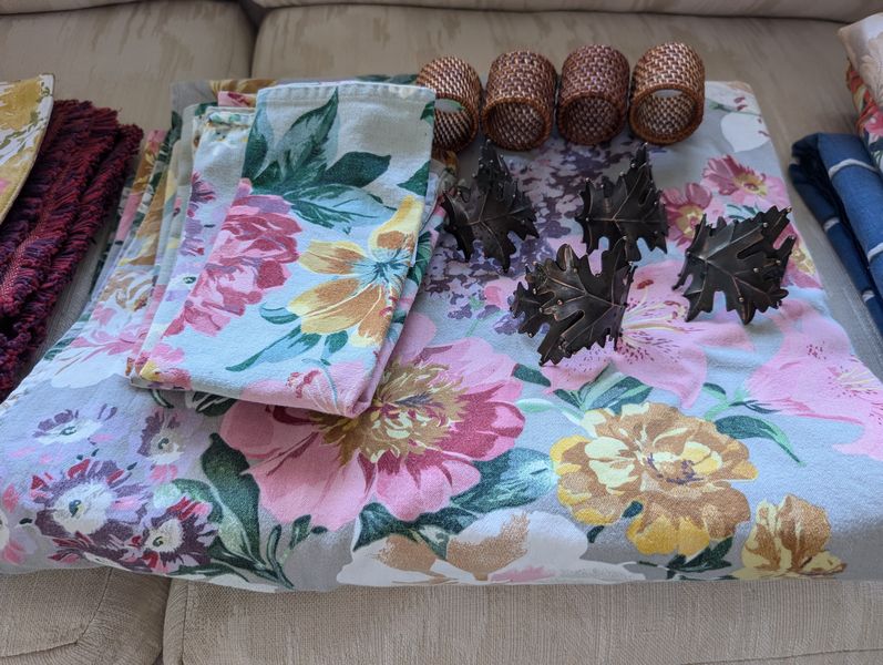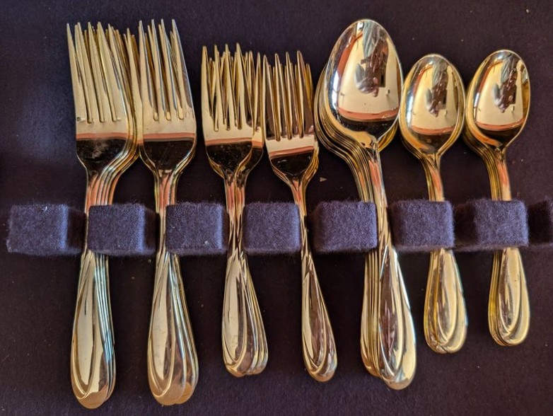 Farberware Gold Flatware Set, Table Linens. Farberware complete 5-piece, service of 12 flatware set with hostess pieces; assort tables linens, incl tablecloths & napkins; assort napkin rings-see photos for quantity & details. Items seen in background not incl.