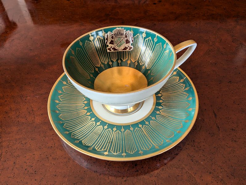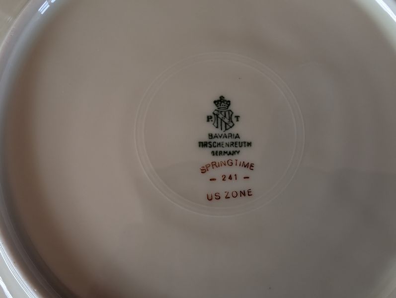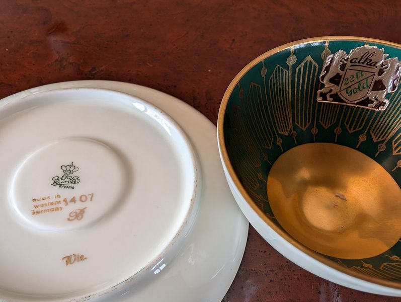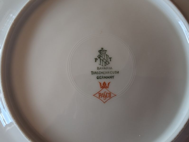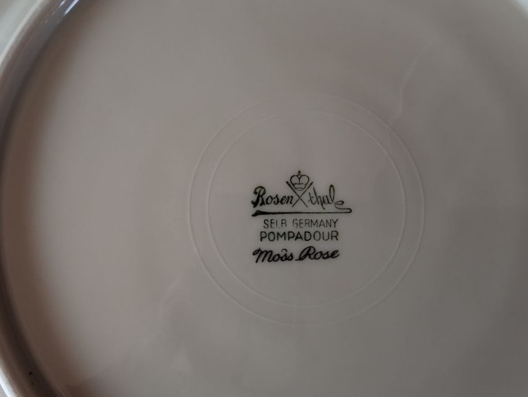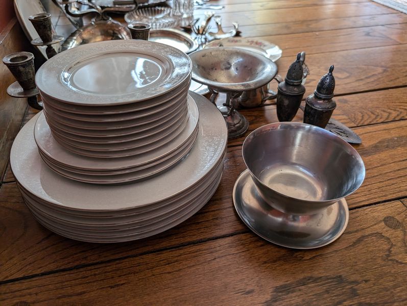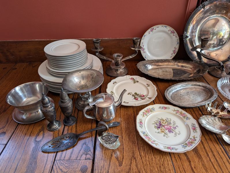 Vintage Silverplate and Porcelain Entertaining. Wilkshire House "Bridal Lace" by Jepieceor dish set (incomplete) with 1'diameter platter; 9"diameter bowl; 10'diameter dinner plate; other pieces; three small plates (one Rosenthal Pompadour; two Bavaria); 24K gold demitasse cup & saucer set; silverplate platter, 14"diameter; round glass platter, 13.5"diameter; small spoon set in box; other related items as seen in photos.