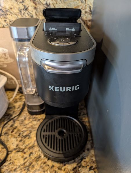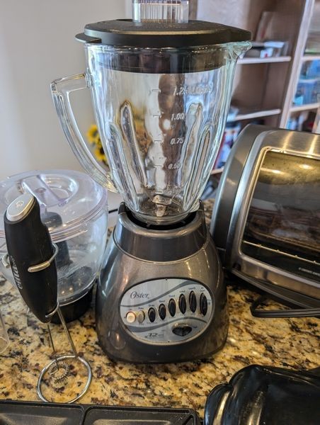 Countertop Appliances, featuring Keurig. Appliances incl: Oster 12-speed mixer; Hamilton Beach toaster oven; Oggi coffee carafe; Amazon sandwich/waffle maker; Aroma rice cooker; Rival crock pot with handles; Keurig coffee maker; Braun coffee grinder; thermal coffee carafe; drawer with utensils-see photo.