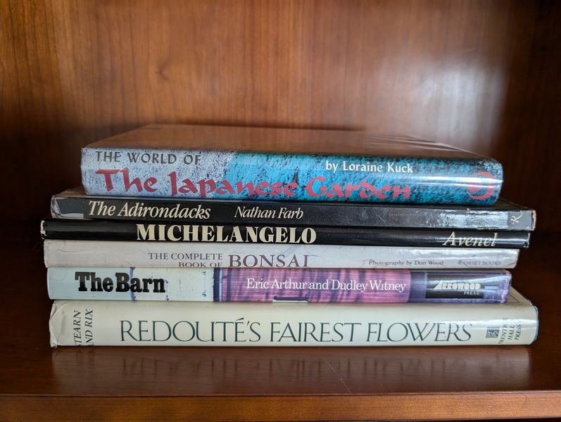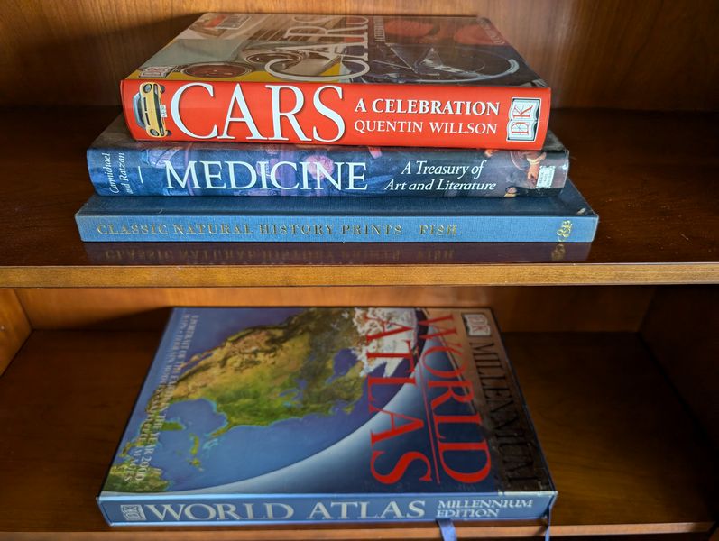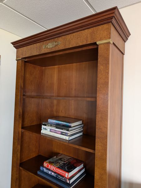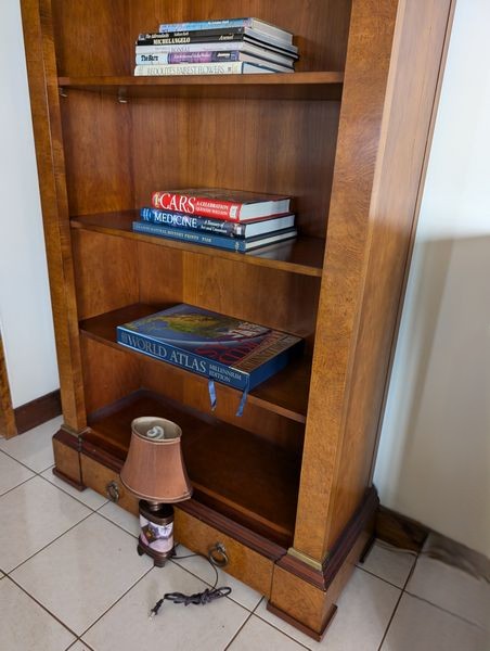 Baker Bookcase, Lamp, Books. Likely Baker open 5 shelf bookcase with drawer below, 40"Wx16"Dx84"H; small table lamp; world atlas and other lg coffee table books.