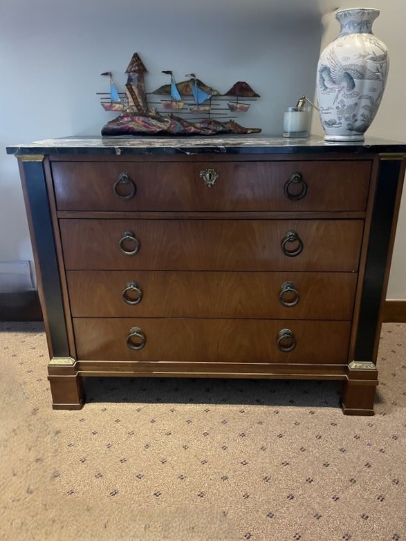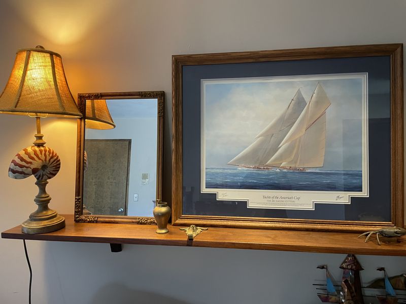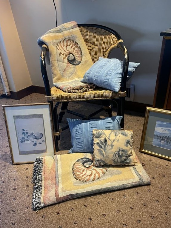Baker Chest, Chair, Décor. Baker 4-drw chest; woven chair; sign America's Cup picture; copper sailboat; Charles Morgan print; brass beach décor; other related items as seen in photos, incl throw blankets & pillows. Located on the second floor.