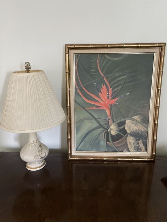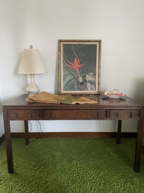 Desk, Chair, Lamp, Décor. Wood table-style desk with drawer; upholstered chair; wall art; lamp; décor. Located on the second floor.