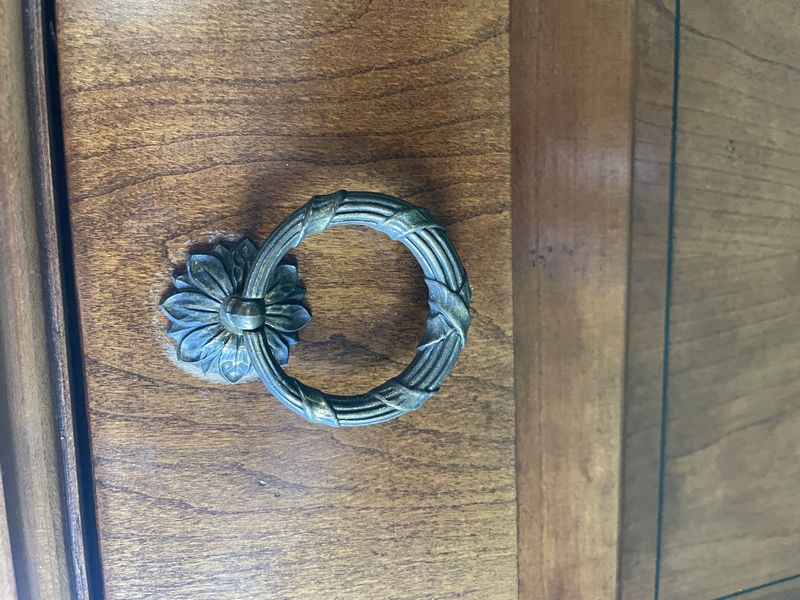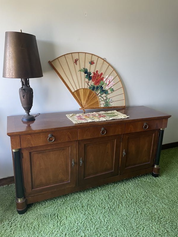 Baker Dresser/Sideboard, Chair, Décor. Baker sideboard (may be used as a dresser); vintage wood chair with upholstered seat; table lamp with shade; décor. Located on the second floor.