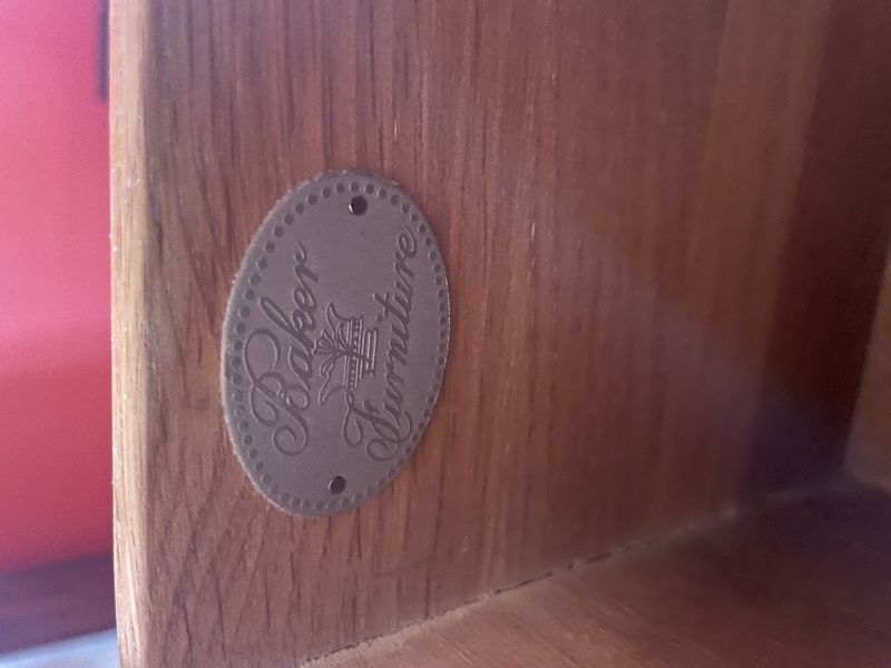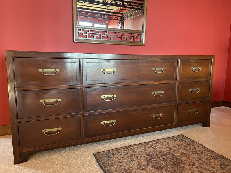 Asian-Style Dresser, Mirror, Throw Rug. Baker nine-drawer dresser with brass HW; matching Baker wall mirror; small area rug. Matches furniture in lots #37 & #39. Located on the second floor. Bring help to safely remove.