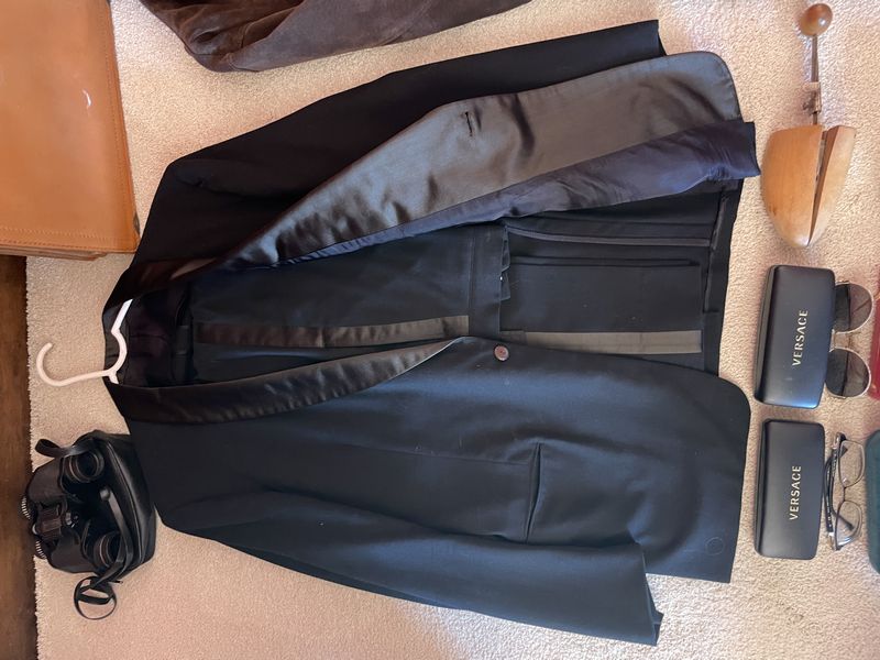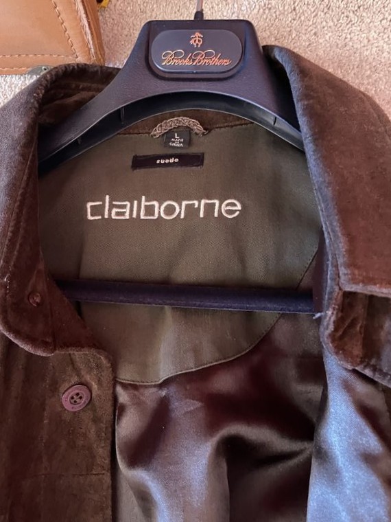 Men's Boutique. Two leather jackets, incl one Claiborne; leather briefcase; Columbia straw hat; Versace glasses; wood shoe forms; ties; other related items as seen in photos. Located on the second floor.