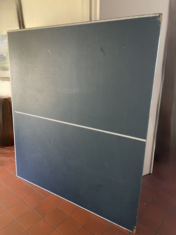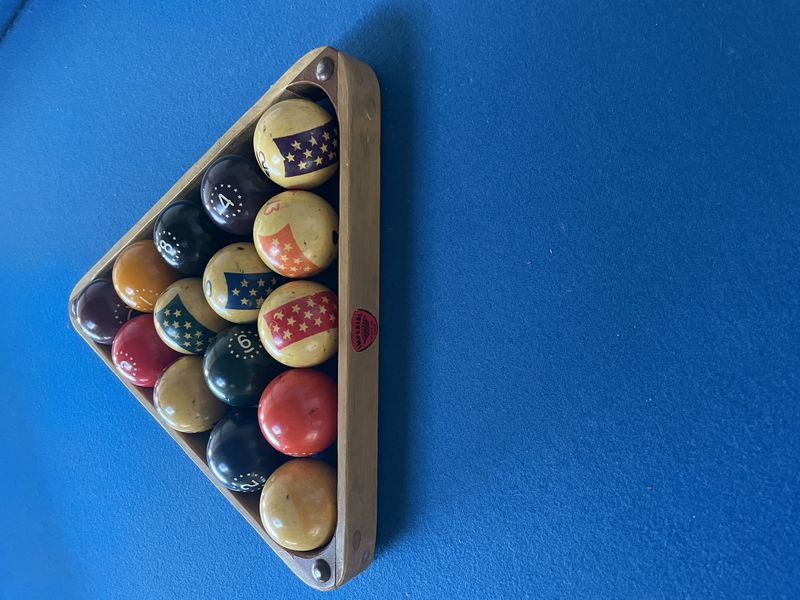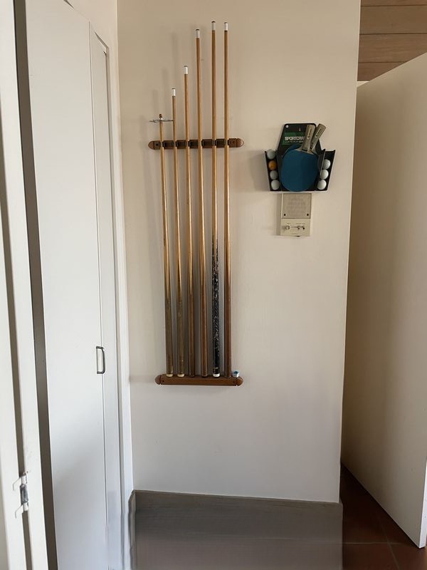 Pool Table. Pool table in light wood with blue felt; pool table cues & balls; optional ping pong table top (damaged) with accessories. Loc on main floor near front door. Must bring help to safely dismantle & remove.