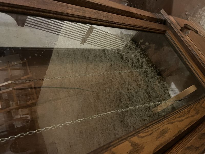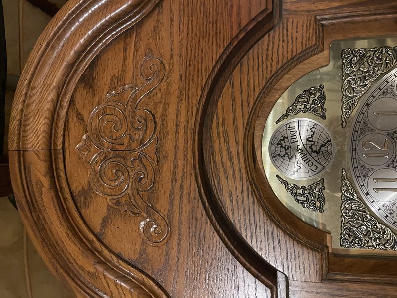 Howard Miller Grandfather Clock. Wood cabinet Howard Miller grandfather clock with brass face, pendulum & weights. See photos for details. Located in the basement..