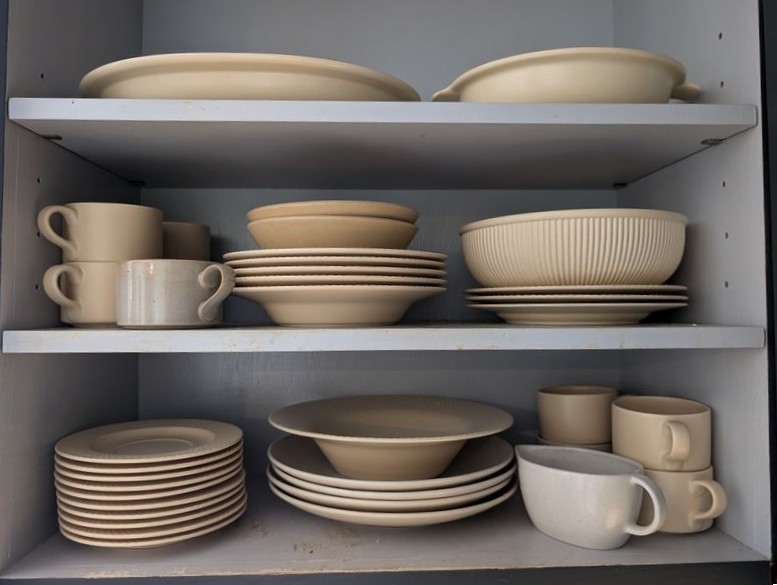 Stoneware, featuring Wedgwood, Pfaltzgraff, Dansk. Wedgwood "Rattan" bowl, 11"diameter; Pottery Barn dinner plate, 11"diameter; Pfaltzgraff oval platter, 14"L & handle oval platter, 11"L; eight Wedgwood coffee mugs; Dansk coffee mug; 10 saucers; stainless steel utensils in drawer-see photos for details.