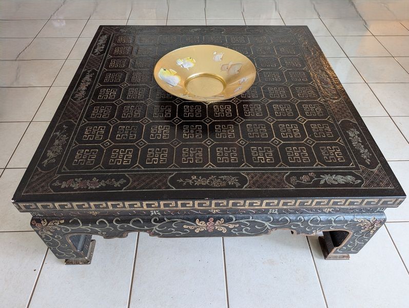 Asian-Style Coffee Table, Bowl. Heavy coffee table, 38"sq x15.5"H; decorative bowl, 13.5"diameter. See photos for details.