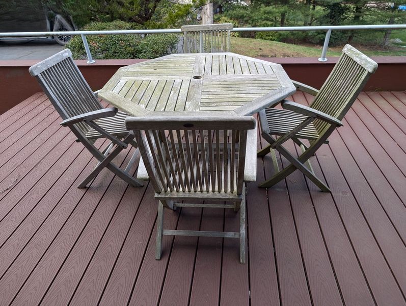 Teak Outdoor Furniture. Teak furniture incl: 5-piece Kingman set with octagon table, 47"diameter x29"H; set of 4 folding chairs, ea. 23"Wx21"Dx3'H; lounger, 2'Wx64"Lx3'H; optional rectangle table & pr chairs-see photos. Loc on back deck.