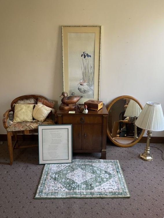 Baker Chest, Chair, Décor. Baker small chest with single drawer & cab storage; chair; oval mirror; brass lamp; framed poem by Robert Frost "The Road Not Taken"; wooden decoys & box; throw pillows and other related items as seen on photos. Located on the second floor.