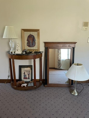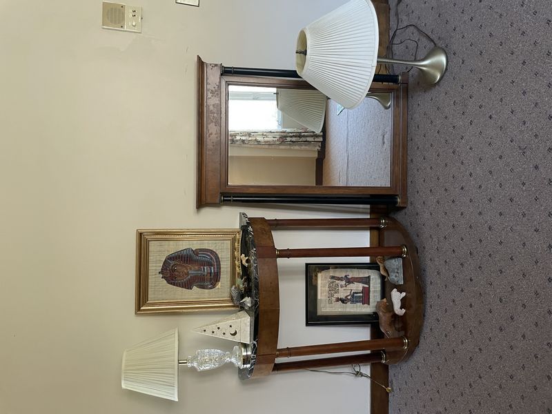 Baker Entry Table, Mirror, Lamp, Décor. Baker demilune table; Baker wall mirror; crystal table lamp with shade; Egyptian art & décor; animal décor; other related items as seen in photos. Located on the second floor.