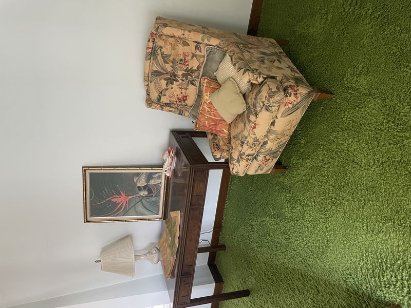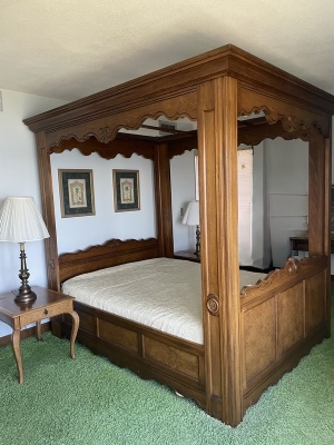 Wood Canopy Bed, Side Tables. Queen bed with two nightstands; brass table lamps with shades; two prints; bedding. Located on the second floor. Bring tools to dismantle and help to safely remove.