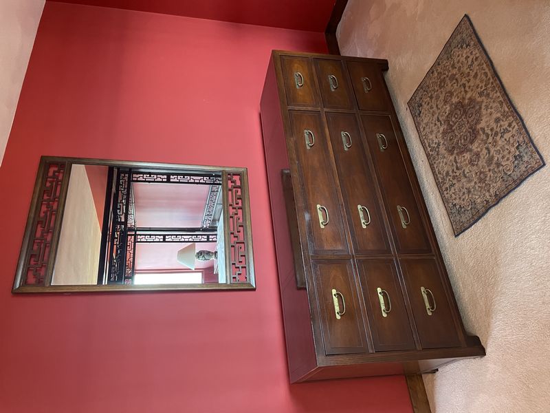 Asian-Style Dresser, Mirror, Throw Rug. Baker nine-drawer dresser with brass HW; matching Baker wall mirror; small area rug. Matches furniture in lots #37 & #39. Located on the second floor. Bring help to safely remove.