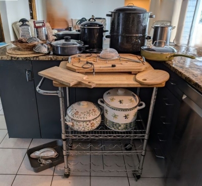 Cookware, Rolling Wine Rack Utility Cart. Very large lobster pot/double boiler with lid, 16"diameter x16"H; T-Fal covered fry pan, 10"; T-Fal covered pot, 11"diameter; Rival electric fry pan with lid & cord; Minton, German-made floral pot with cover, 10"diameter; Royal Doulton floral pot with lid, 10"diameter (matches smaller pot in lot #20; cutting boards, largest 21"Lx14"W; stainless steamers; cheese graters; Toast Master electric knife; placemats; rolling wine holder cart with cutting board top.