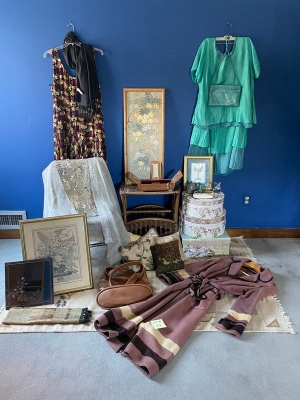 Women's Boutique, featuring Ugg. Chrome chair with cane seat; Liz Claiborne dress; Ugg handbag; Asian-style print; Gustine Todd jacket & sequin top; 5'x7'area rug; vintage coat; costume jewelry; hat box set; mini pillows. Located on the second floor.