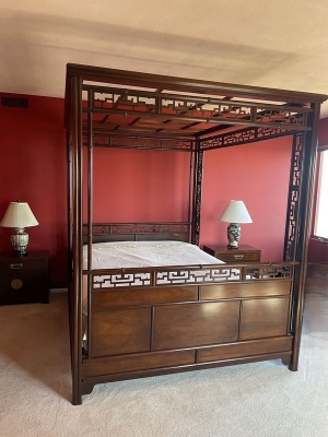 Asian-Style Wood Canopy Bed, Nightstands, Lamps. Queen bed with matching pr nightstands with single dovetailed drawers, brass HW & storage; two table lamps with shades. Matches furniture in lots #38 & #39. Located on the second floor. Bring tools to dismantle and help to safely remove.