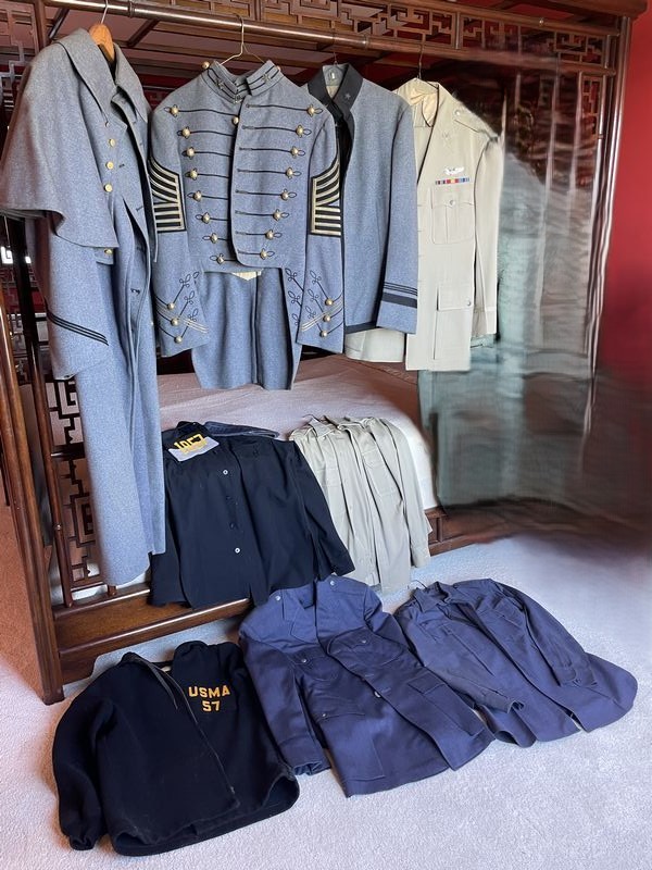 Military Uniforms. Revolutionary and other military uniforms. See photos for details. Furniture seen in photos not incl. Located on the second floor.