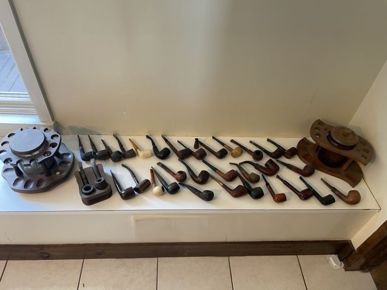 Pipes and Stands. Over 2-doz pipes with wood pipe stands. See photos for details.