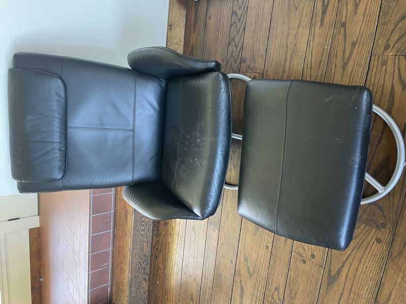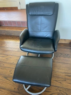 Leather Chair, Foot Rest, Electric Fireplace. Electric propane fireplace with marble surround; Ikea leather-like chair & footrest.