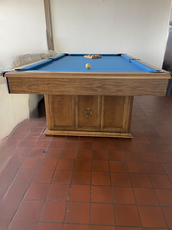 Pool Table. Pool table in light wood with blue felt; pool table cues & balls; optional ping pong table top (damaged) with accessories. Loc on main floor near front door. Must bring help to safely dismantle & remove.